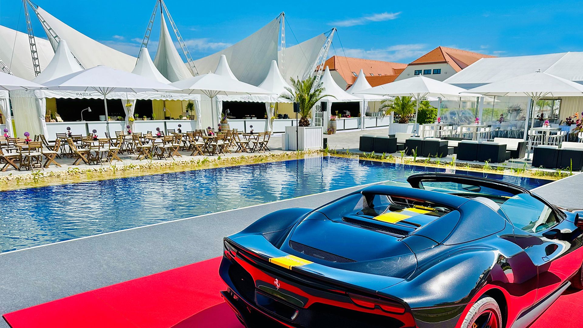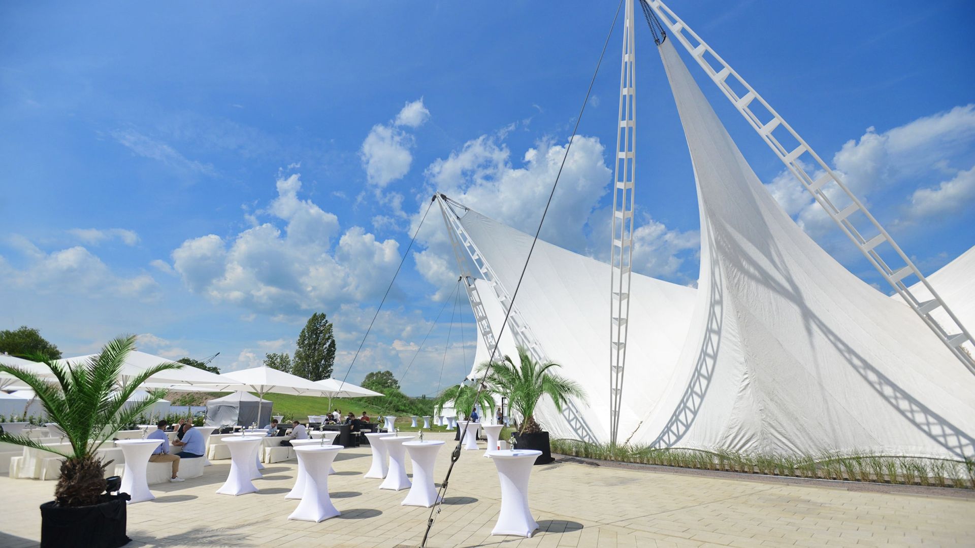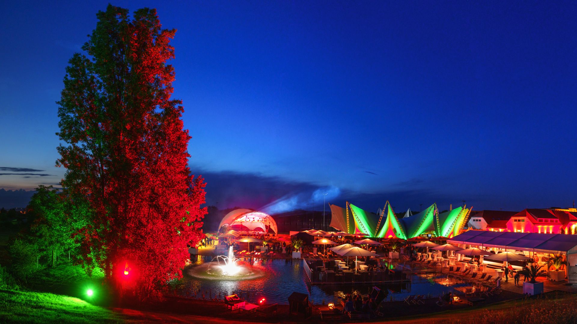 Über 15.000 m² Outdoor-Bereich mit Grünflächen, Wasserflächen und integrierten Bühnen eignen sich für Open-Air-Events und Sommerfeste.